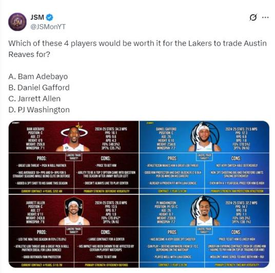 湖媒JSM覺(jué)得如果湖人可以得到像阿德巴約、加福德、賈萊特-阿倫、PJ-華盛頓這樣的球員的話(huà)可以送走里夫斯。
