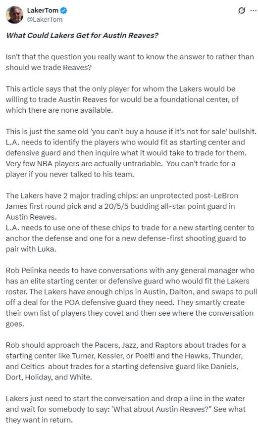 他也發(fā)布了一篇關(guān)于湖人不會(huì)賤賣(mài)里夫斯的長(zhǎng)文,因?yàn)槔锓蛩?、克?nèi)克特是湖人僅有的優(yōu)質(zhì)資產(chǎn),湖人要為了補(bǔ)強(qiáng)合格輪換才可能送出里夫斯、克內(nèi)克特。