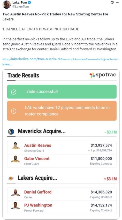 湖媒Laker Tom也覺(jué)得如果能得到華盛頓+加福德得話(huà),愿意送出里夫斯+文森特,因?yàn)檫@邊湖人的先發(fā)就湊齊了東契奇、華盛頓、詹姆斯、波爾津吉斯、加福德,這套先發(fā)兼具尺寸、防守、空間。