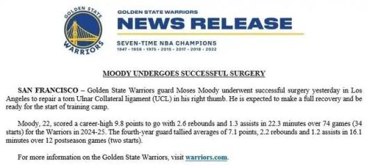 北京時間 5 月 23 日,金州勇士官宣,球隊后衛(wèi)摩西·穆迪已在洛杉磯成功接受右手拇指尺側(cè)副韌帶(UCL)撕裂修復手術(shù),預計將在今年秋季訓練營前完全康復。