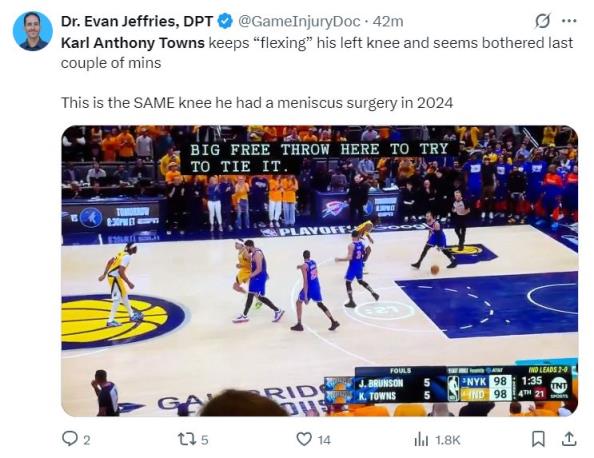 醫(yī)學(xué)專家埃文-杰弗里斯曬出末節(jié)還剩1分35秒唐斯在場上一瘸一拐的瞬間,他寫道:“KAT不停地活動自己的左膝,最后幾分鐘看起來他的左膝很不舒服,他在2024年時(shí)接受過左膝半月板修復(fù)手術(shù)?!?/p>