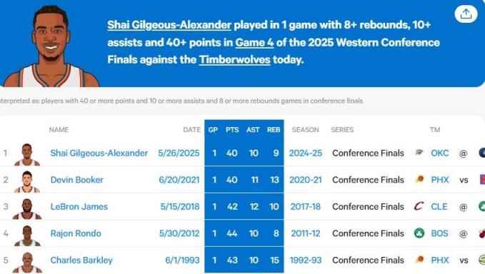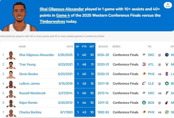 本場比賽,亞歷山大出戰(zhàn)40分02秒,30投13中得到40分9籃板10助攻1搶斷,他也成為了歷史上第七位在分區(qū)決賽中單場至少得到40分10助攻的球員。