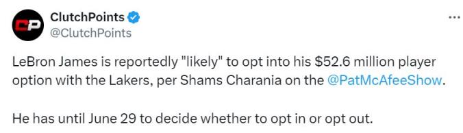 Shams稱:“我得到的消息是,他很可能會選擇執(zhí)行選項……這是大概率事件,也是目前的計劃。但他的選項截止日期是6月29日,所以他還有大約一個月的時間來做出決定。他和湖人之間將會進行一些重要對話,探討球隊未來的陣容架構。因為無論他再打一個賽季還是多個賽季,都希望身處有競爭力的環(huán)境中?!?/p>