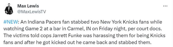 24歲步行者球迷觀戰(zhàn)東決刺傷尼克斯球迷 被控多項罪名