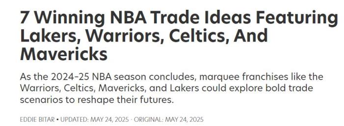 近日,美媒FW建議7支球隊(duì)都去進(jìn)行大交易,而且他們覺(jué)得這7個(gè)交易方案如果達(dá)成都必然成功:綠凱、勇士、獨(dú)行俠、湖人、快船、籃網(wǎng)。