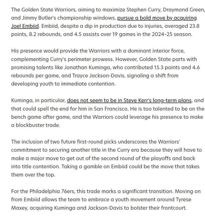 費(fèi)城得到喬納森-庫(kù)明加、波杰姆斯、戴維斯、2028年勇士首輪、2031年勇士首輪。