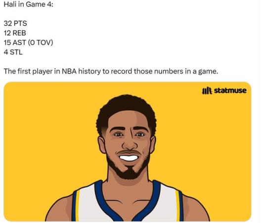 北京時間5月28日,在NBA季后賽東部決賽G4中,印第安納步行者在主場以130-121戰(zhàn)勝了紐約尼克斯,目前,球隊(duì)大比分以3-1領(lǐng)先尼克斯,距離重返總決賽僅差一場勝利。此役,哈利伯頓的表現(xiàn)極其出色,他全場轟下32分12籃板15助攻4搶斷進(jìn)賬,零失誤,正負(fù)值+16,這樣一來,哈利伯頓也是創(chuàng)下了多項(xiàng)神跡。