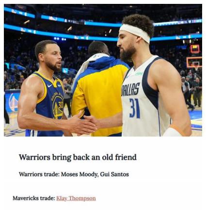 第三筆用穆迪+桑托斯將克萊從獨(dú)行俠換回來(lái)??巳R才是最熟悉科爾體系與庫(kù)里打球方式的二號(hào)位,克萊的空間能力可以最大限度發(fā)揮庫(kù)里的能力,庫(kù)里+克萊+巴特勒+追夢(mèng)的組合才是勇士球迷最希望看到的。