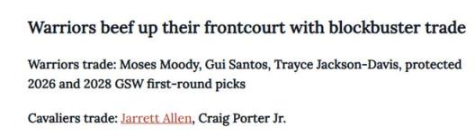 第二筆交易是用穆迪、桑托斯、戴維斯、2026年首輪、2028年首輪從騎士換來(lái)賈萊特0阿倫、小克雷波特。這筆交易勇士補(bǔ)強(qiáng)了最弱一環(huán)五號(hào)位,科爾雖然喜歡用死亡五小,可他也深知有一個(gè)頂級(jí)的吃餅內(nèi)線+護(hù)框內(nèi)線多么重要,如果阿倫能來(lái)到勇士,這支勇士的防守有希望成為聯(lián)盟前三。