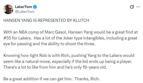 尤其是Laker Tom覺得憑借佩林卡與里奇-保羅的關(guān)系,湖人可以與楊瀚森私下秘密敲定加盟,讓楊瀚森掉到次輪55順位被湖人選中,但湖人承諾給他新秀合同+穩(wěn)定登場時間。