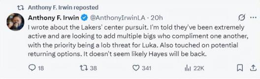 Anthony Irwin表示,海斯回歸湖人的可能性很小,他對季后賽出場時間、角色定位感到很不滿,同時也因此失去了本可以爭取到的收入。從湖人方面來看雷迪克已經(jīng)對 海斯失去信心,除非海斯愿意繼續(xù)拿底薪加上接受新賽季的角色降級,那么海斯才有小概率重返湖人。