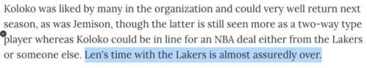 隨后他還透露,亞歷克斯-萊恩在湖人的生涯已經(jīng)完結(jié)。科洛科與賈米森受到湖人球迷的喜愛,這兩位都是拿著雙向合同大概率會回歸,科洛科有希望在湖人拿到一份正式合同(其他球隊也可能給科洛科一份正式合同)。