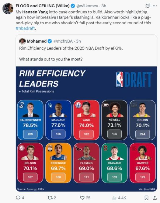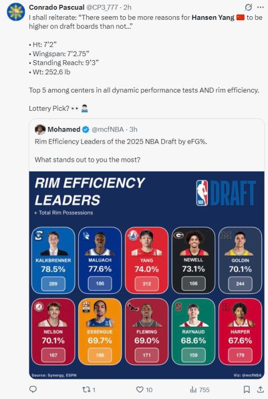 已經(jīng)有不少的美國媒體認(rèn)為楊瀚森會進(jìn)入首輪。