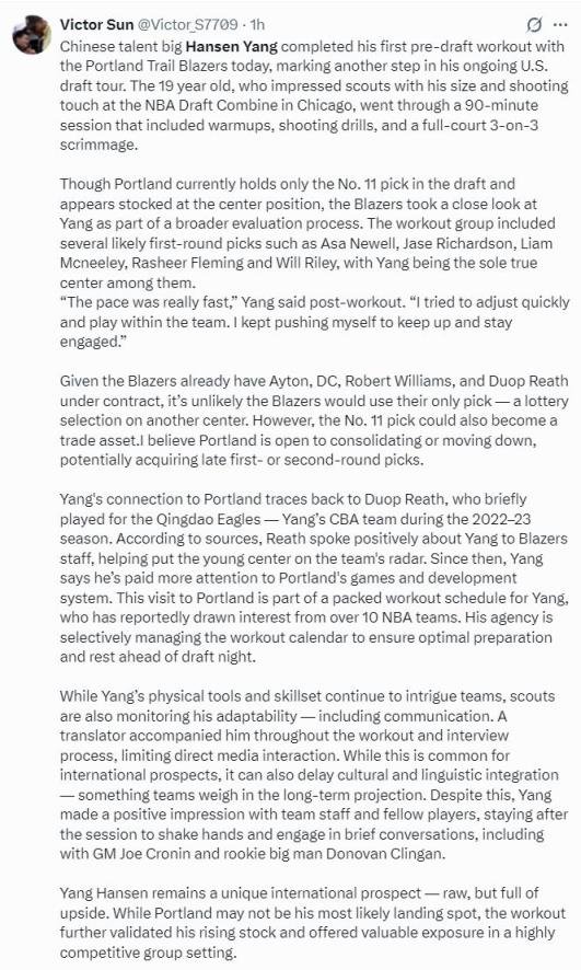 開拓者的選秀專家Victor sun試訓(xùn)后也長文分析了開拓者試訓(xùn)這些首輪超級新秀的意圖,尤其是對楊瀚森而言: