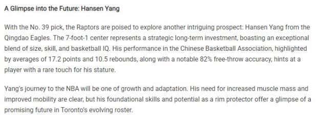 今日多倫多媒體在討論次輪選秀時,也提到了楊瀚森的名字,并將他視為猛龍次輪選擇的目標(biāo)之一。值得一提的是,猛龍在次輪擁有39號簽,也正是雅虎預(yù)測瀚森被選中的順位。