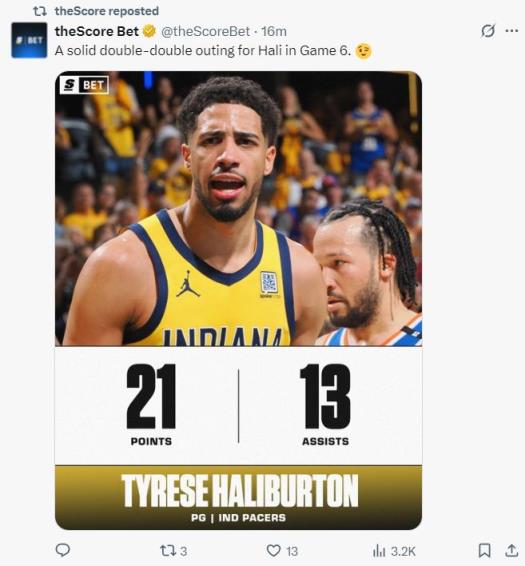 全場比賽,哈利伯頓17中9,三分5中2,罰球1中1,拿到21分13助攻6籃板3搶斷1蓋帽,命中率52.9%,三分命中率40%。