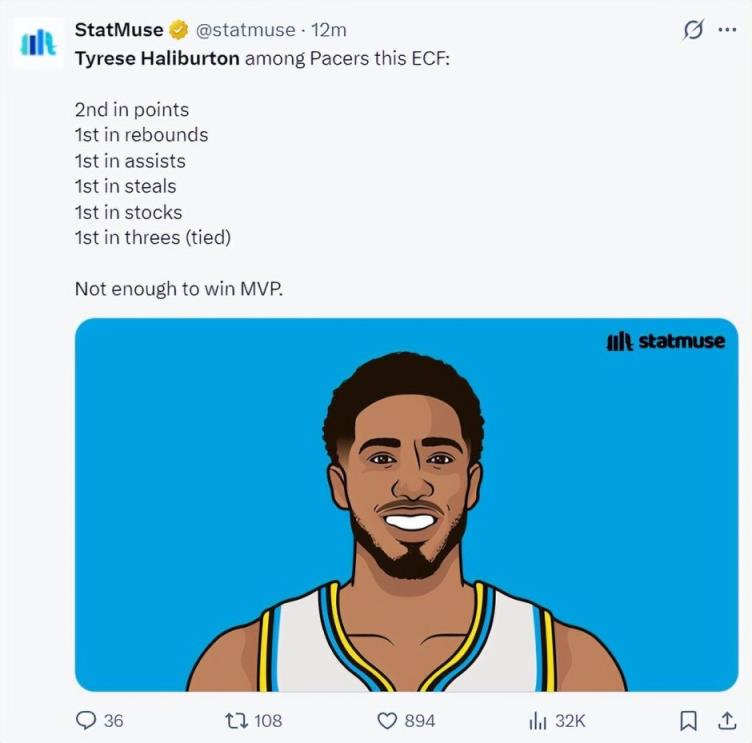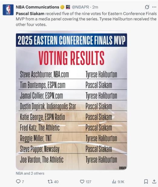 投票顯示西卡5票,哈利伯頓4票,最終哈利伯頓1票之差未能拿到東決MVP。