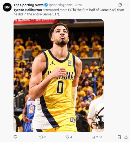 美媒SN:哈利伯頓第六場上半場已經(jīng)出手8次,已經(jīng)超過他G5全場的7次。第三節(jié)哈利伯頓在節(jié)末又有一個(gè)精彩瞬間,還是一次快攻的暴扣,這一節(jié)他3中1拿2分3籃板3助攻1搶斷,三節(jié)打完10分9助攻3籃板3搶斷1蓋帽已經(jīng)填滿數(shù)據(jù)欄。