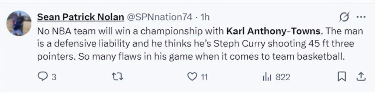紐媒:沒有任何一支球隊可以憑借唐斯拿總冠軍。這人的防守是巨大隱患,他自認(rèn)為自己可以像庫里一樣命中三分,可團(tuán)隊籃球方面他存在諸多缺陷。