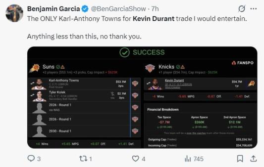在曝出太陽有意唐斯,尼克斯有意杜蘭特后,太陽記者BenJamin Garia就列出一筆交易方案,尼克斯送出唐斯、科勒克、2026年奇才首輪、2026年尼克斯首輪、2030年尼克首輪換杜蘭特。