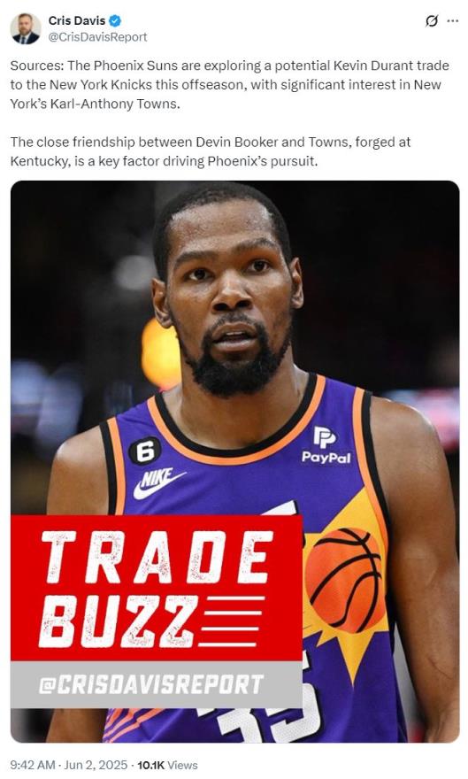 根據(jù)紐約記者克里斯-戴維斯的報(bào)道,有消息人士透露,菲尼克斯太陽探索休賽期交易杜蘭特到紐約尼克斯的可能性,鳳凰城對(duì)紐約的唐斯感興趣,布克與唐斯在肯塔基大學(xué)時(shí)期結(jié)下了深厚的友誼,這是太陽推動(dòng)交易的關(guān)鍵因素。