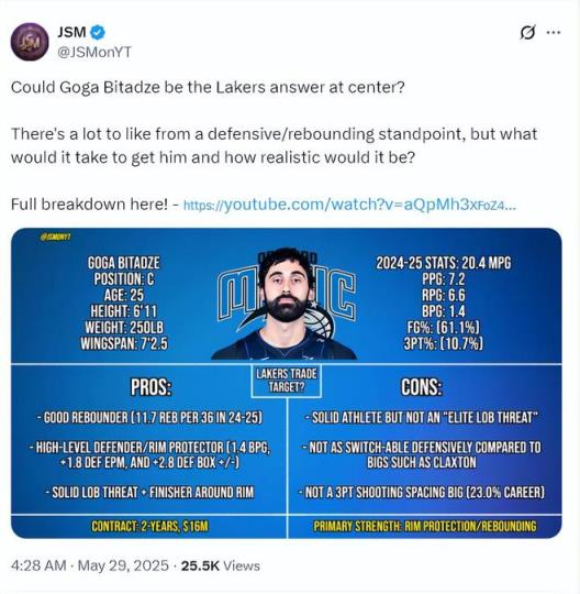實(shí)際上在5月29日,湖人媒體JSM就說(shuō)過比塔澤是湖人理想的中鋒,防守、籃板都值得稱贊,湖人很需要他這樣的五號(hào)位。