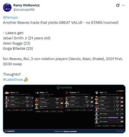 美媒RW覺得湖人既然要交易得到比塔澤不如一步到位將籃網(wǎng)、火箭都拉入交易,換言之就是四方大交易——