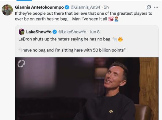 對于外界認(rèn)為詹姆斯沒有技術(shù)的質(zhì)疑,字母哥今天發(fā)文力挺:“如果真的有人認(rèn)為這個地球上最偉大的球員之一沒有技術(shù),兄弟,我是真的啥都見過了 。
