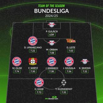 5月19日訊 WhoScored根據(jù)球員評分列出本賽季德甲最佳陣,凱恩等五名拜仁球員入選,維爾茨,哈維-西蒙斯在列。