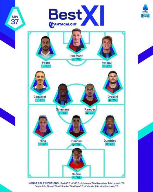 意甲第37輪最佳陣容:佩德羅、鄧弗里斯、鈴木彩艷入選