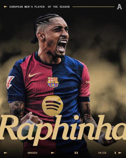 拉菲尼亞獲歐洲聯(lián)賽賽季最佳球員稱號(hào),34球24助閃耀賽場(chǎng)