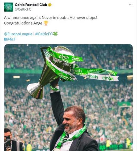 賽后凱爾特人俱樂部更新社媒,向熱刺主帥波斯特科格魯送上祝福。凱爾特人俱樂部寫道:“你再次率隊成為最后的贏家。從未懷疑,他永不停歇!祝賀你,安格!”