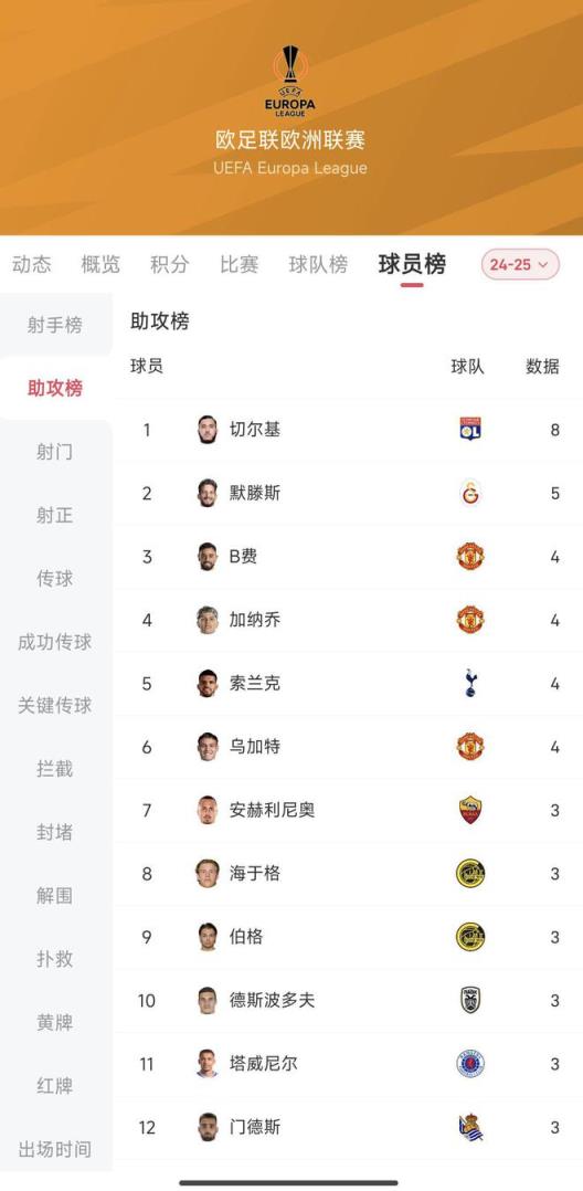 助攻方面,里昂的切爾基以8次助攻排名第一,緊隨其后的是排名第二的默滕斯,B費(fèi)、加納喬、索蘭克和烏加特以4粒助攻并列第二。