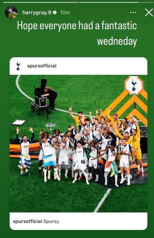 當(dāng)?shù)貢r(shí)間周三晚間,熱刺擊敗曼聯(lián)奪得歐聯(lián)冠軍,利茲聯(lián)前鋒哈里-格雷時(shí)隔一年截取熱刺奪冠的慶祝圖,并配文“希望所有人都有個(gè)美妙的周三”。