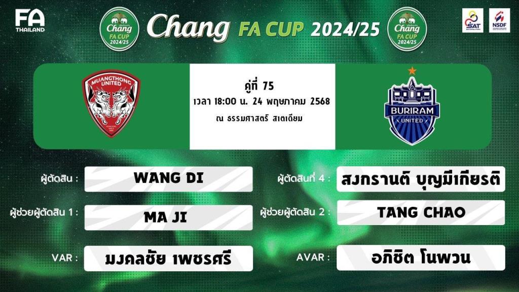 本屆泰國足總杯決賽的對陣雙方是蒙通聯(lián)和武里南聯(lián)隊,兩隊將于當?shù)貢r間5月24日下午六點在法政體育場 對決。執(zhí)法本場比賽的裁判是中國籍裁判王迪。