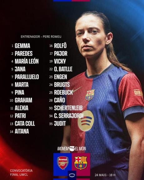 5月23日訊 北京時間5月25日凌晨,巴薩女足將在歐冠決賽中對陣阿森納女足,巴薩女足公布了歐冠決賽的球員名單。