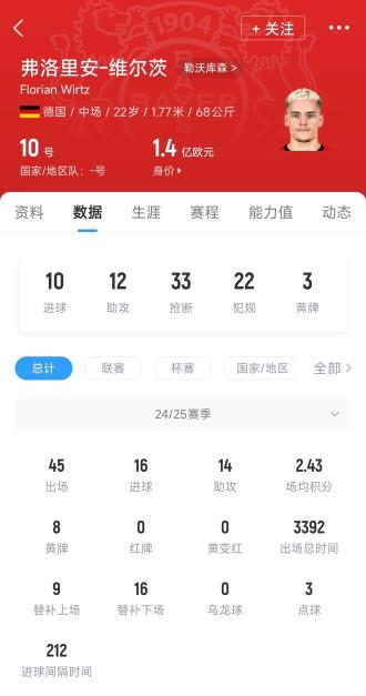 維爾茨現(xiàn)年22歲,本賽季代表勒沃庫森出戰(zhàn)45場,首發(fā)36次,貢獻(xiàn)了16球14助攻。目前,維爾茨德轉(zhuǎn)身價為1.4億歐。他在勒沃庫森幫助球隊獲得過1次德甲冠軍、1次德國杯冠軍和1個德超杯冠軍。維爾茨與藥廠原本的合同2027年到期。