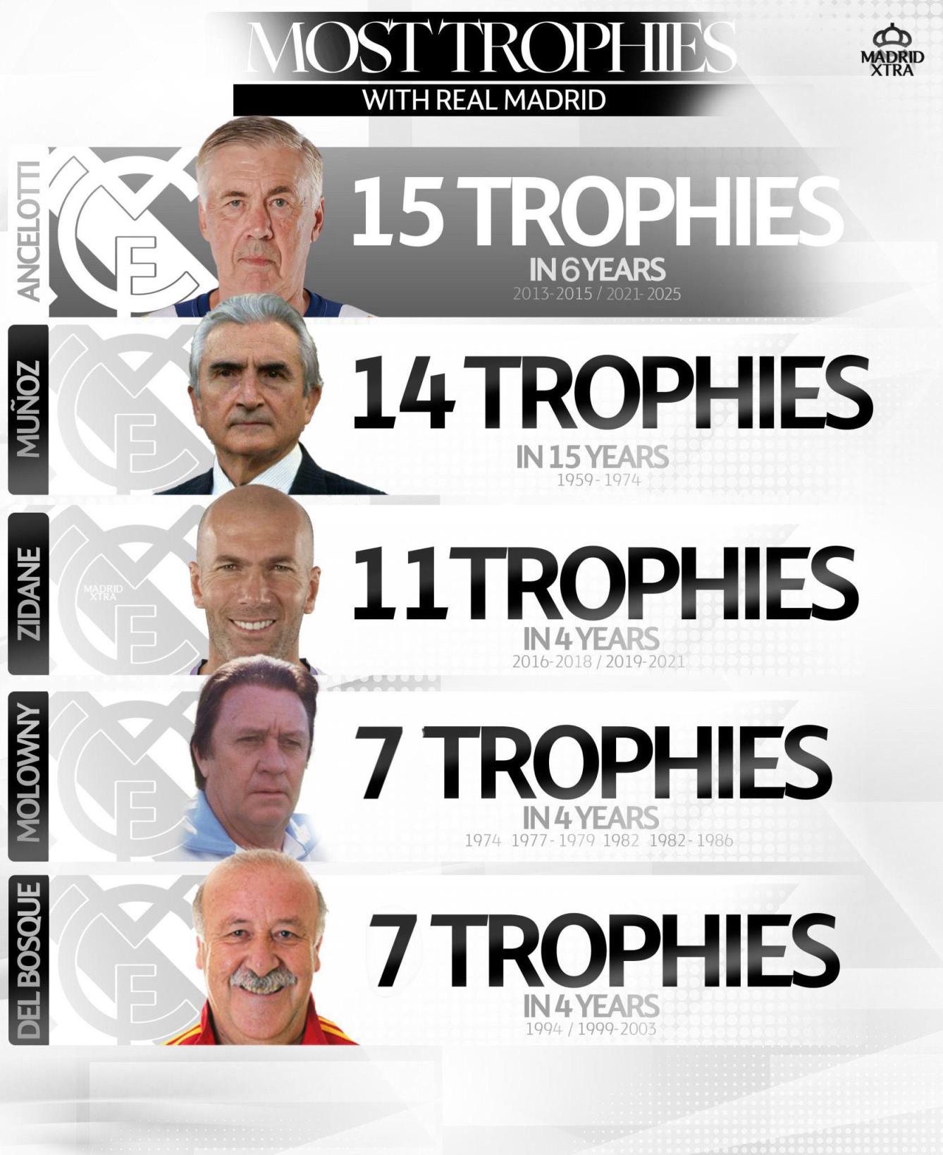 在安切洛蒂結(jié)束第二段皇馬執(zhí)教生涯后,海外皇馬博主Madrid Xtra在社媒上列出了皇馬歷任教練帶隊(duì)奪冠次數(shù)排行的TOP5,安切洛蒂以6年15個(gè)冠軍居首。