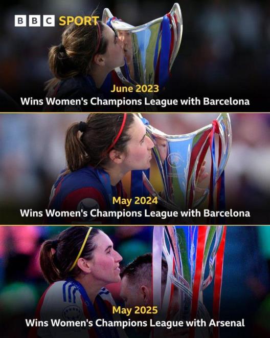 據(jù)數(shù)據(jù)平臺OPTA統(tǒng)計,現(xiàn)效力于阿森納女足的西班牙前鋒卡爾登泰在近5個賽季的女足歐冠聯(lián)賽中,隨隊獲得了其中4次冠軍,其中她3次隨巴薩女足奪冠,1次隨阿森納女足過關(guān),此外加上本次她已連續(xù)三年捧得女足歐冠冠軍。