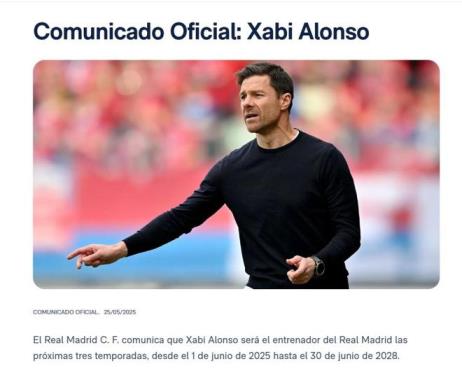 北京時(shí)間5月25日晚,西甲豪門皇家馬德里俱樂部官方宣布,43歲的哈維-阿隆索將在今夏正式接替安切洛蒂,擔(dān)任皇馬新任主教練,雙方將簽約3年(2025年6月1日至2028年6月30日),年薪1200萬歐元。