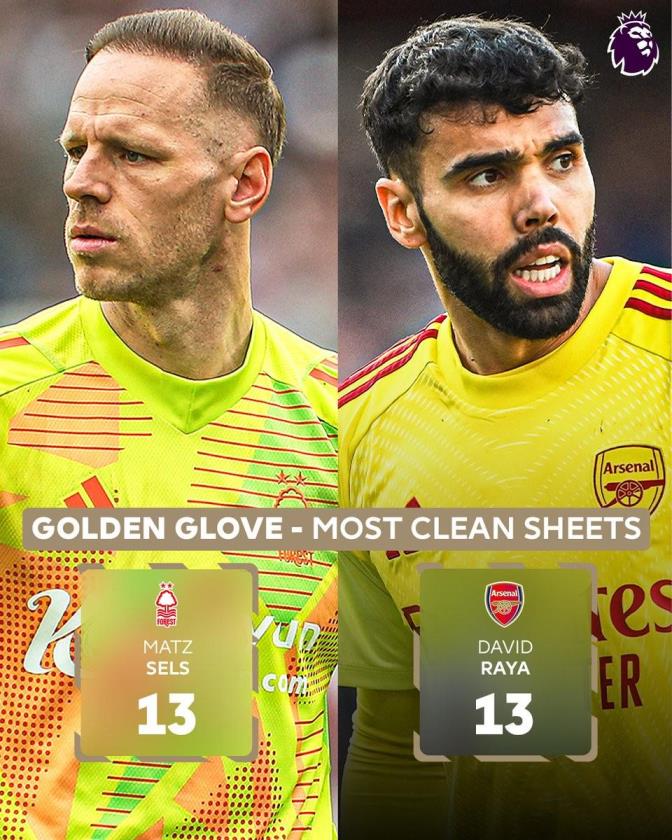 2024-25賽季英超收官戰(zhàn),在諾丁漢森林和阿森納先后丟球后,諾丁漢森林門將澤爾斯和阿森納門將戴維-拉亞確定分享本賽季英超金手套。