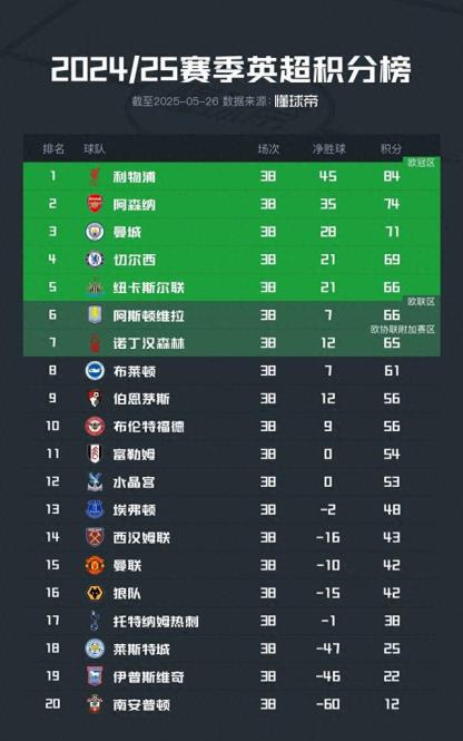 英超聯(lián)賽已經(jīng)完成全部38輪的比賽。在本賽季中,利物浦成功奪得了英格蘭頂級(jí)聯(lián)賽的第20座冠軍獎(jiǎng)杯,阿森納、曼城、切爾西、紐卡斯?fàn)柡蜔岽坛晒Λ@得了歐冠資格,而三支升班馬球隊(duì)則全部降級(jí)。以下是完整的積分榜。