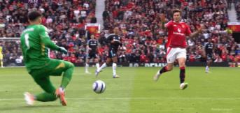 羅杰斯搶在巴因迪爾之前將球捅走并射入空門,但主裁判托馬斯-布拉莫爾已提前吹哨,判罰羅杰斯對曼聯(lián)門將犯規(guī)。