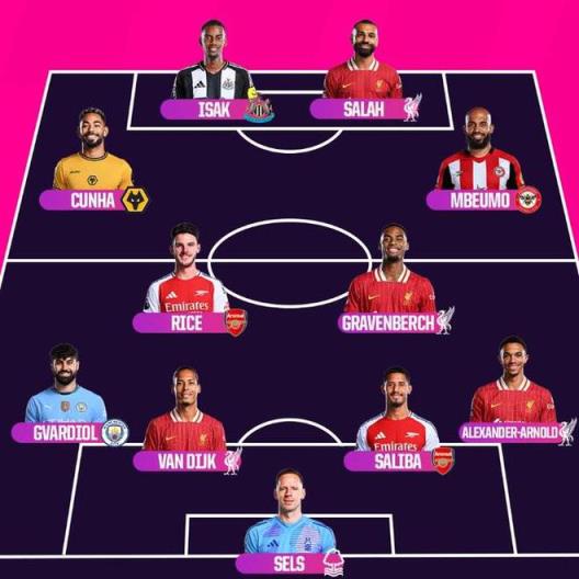 2024-25賽季英超落幕,知名足球數(shù)據(jù)機構(gòu)Opta評選了本賽季英超最佳陣容,薩拉赫領(lǐng)銜,阿諾德、賴斯、伊薩克等人在列。