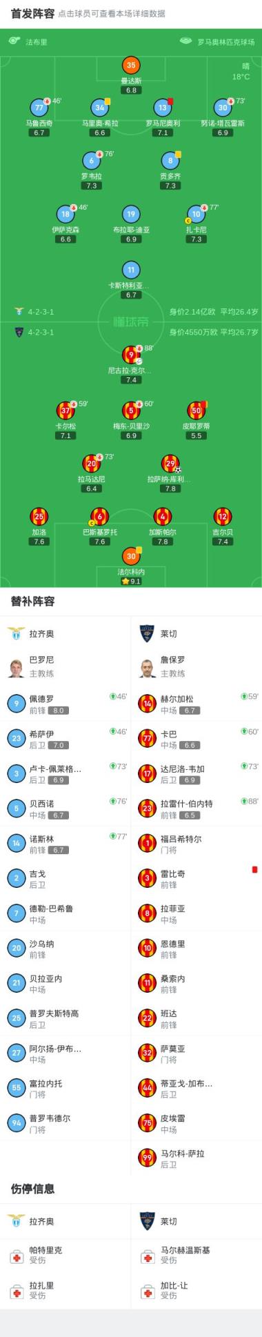 北京時間5月26日意大利足球頂級聯(lián)賽 聯(lián)賽 第38輪,拉齊奧主場對陣萊切。萊切拉薩納-庫利巴利破門。最終比分拉齊奧 0-1 萊切。