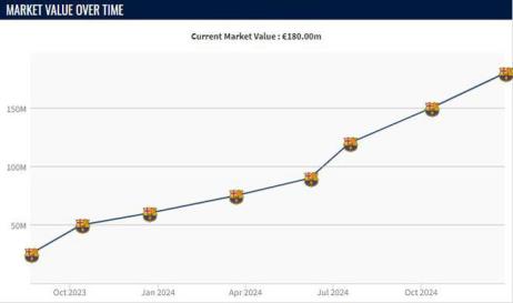 本賽季是亞馬爾出道以來的第二個(gè)完整賽季,俱樂部數(shù)據(jù)與首個(gè)完整賽季(23/24賽季50場7球9助攻)相比有了大幅進(jìn)步。此外,亞馬爾的身價(jià)也在17歲這一年突飛猛進(jìn),從9000萬歐飆升到1.8億歐。