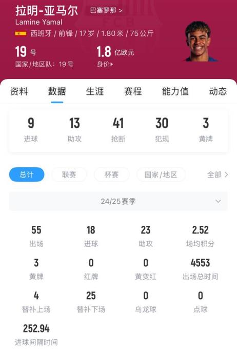 本賽季亞馬爾表現(xiàn)出色,為巴薩打進18球、助攻23次,幫助球隊拿下西甲冠軍、西班牙國王杯冠軍以及西班牙超級杯冠軍。目前其德轉(zhuǎn)身價已達1.8億歐元。