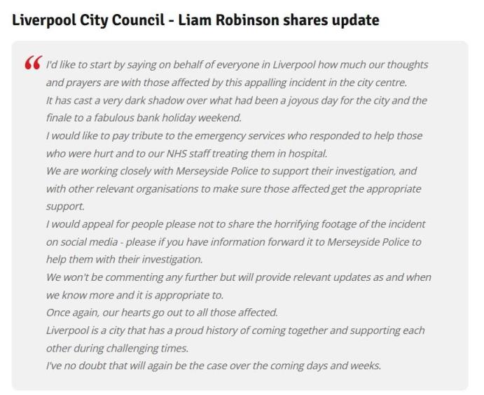 我謹(jǐn)代表利物浦全體市民,首先向市中心這起駭人聽聞事件中的受害者表示最深切的關(guān)切與慰問。這場悲劇給原本洋溢著節(jié)日歡愉的城市蒙上了沉重的陰影,使這個(gè)美好的銀行假日周末的尾聲驟然黯淡。