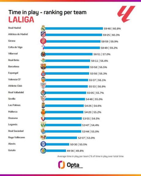 5月27日訊 本賽季西甲聯(lián)賽已經(jīng)落幕,數(shù)據(jù)平臺OPTA統(tǒng)計了本賽季西甲各隊的場均凈比賽時長,其中皇馬以59分40秒居首,馬競59分25秒其次,巴薩55分58秒排在第7位。