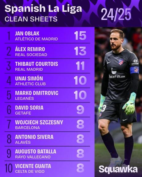 2024/25賽季西甲聯(lián)賽門將零封場(chǎng)次排行榜